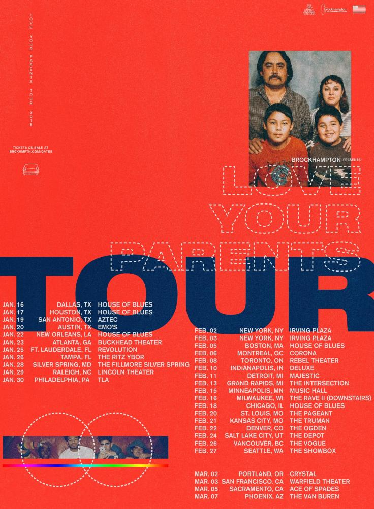 Las posibilidades que un país como Estados Unidos ofrece a un grupo «independiente» para embarcarse en una gira son muy amplias, tan solo en el estado de Texas de donde son originarios los BROCKHAMPTON, suman cuatro las fechas que esta Boy Band tuvo como parte de Love Your Parents, las locuras y acontecimientos del inicio de este amplio tour quedaron grabadas en un vídeo que pueden ver aquí abajo, no es raro que los Brock graben sus presentaciones con este formato DIY, creemos que esto es un plus muy bueno para sus fans y todas las bandas en tour lo deberían de hacer.